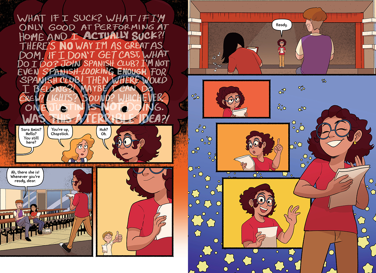 At first, Sara's got mixed feelings about middle school. But she finds comfort in TV -- whether she's watching it, performing her favorite scenes, or imagining her life is a show itself. So when she joins drama club, Sara discovers a community where she can be anything she wants -- including herself. Has Sara finally found a place to fit in? Or will she instead find herself buried under her growing leg hair and off-stage friendship drama?
